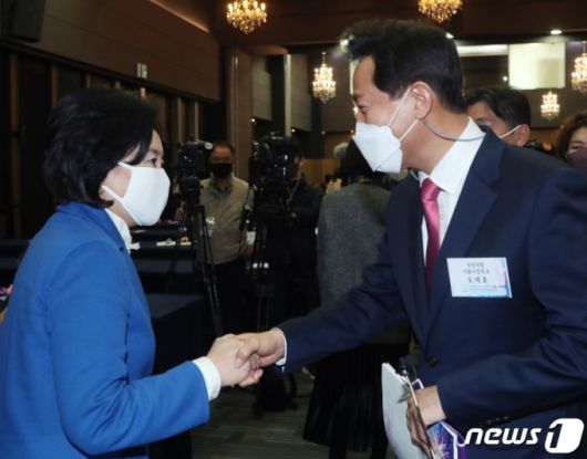박영선 더불어민주당 서울시장 후보(왼쪽)와 오세훈 국민의힘 서울시장 후보가 8일 오후 서울 영등포구 공군호텔에서 열린 제113주년 3·8 세계 여성의 날 기념식에 참석해 인사하고 있다./사진=뉴스1 |