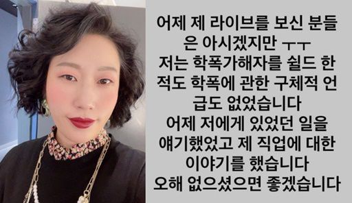 김영희는 지난 17일 자신의 인스타그램에 “어제 제 라이브를 보신 분들은 아시겠지만 저는 학폭 가해자를 쉴드한 적도, 학폭에 관한 구체적 언급도 없었다”고 해명했다.