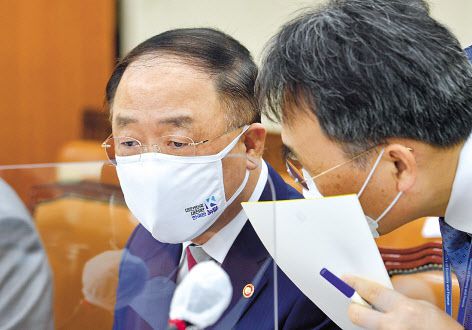 홍남기 경제부총리 겸 기획재정부 장관이 18일 국회에서 열린 기획재정위원회의 전체회의 시작전 보고를 받고 있다. [연합] |