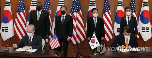 이날 오전 서울 종로구 도렴동 외교부청사 17층 로비에서 열린 가서명식에는 정의용 외교부 장관·서욱 국방부 장관과 전날 방한한 미국 토니 블링컨 국무장관·로이드 오스틴 국방장관이 참석했다.