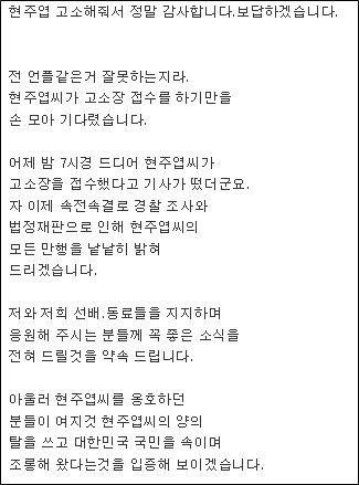 현주엽 고소해줘서 정말 감사합니다. 보답하겠습니다. 전 언플 같은 거 잘 못 하는지라. 현주엽 씨가 고소장 접수를 하기만을 손 모아 기다렸습니다.