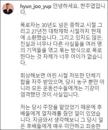 이에 현주엽은 같은 날 자신의 SNS에 "폭로자는 30년도 넘은 중학교 시절 그리고 27년 전 대학재학 시절까지 현재에 소환했다. 그리고 있지도 않은, 진실과 너무나 다른 사실들을 여러 명의 기억들을 엮고 묶는 방식으로 폭로한다는 것 자체가 너무 어이가 없다"라며 학폭 의혹을 부인했다.
