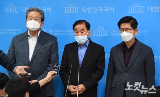 김무성 전 새누리당 대표와 이재오 국민의힘 상임고문, 김문수 전 경기도지사(왼쪽부터)가 18일 국회 소통관에서 기자회견을 열어 오세훈 국민의힘 서울시장 후보와 안철수 국민의당 서울시장 후보의 단일화 협상 결렬과 관련해 실무 협상 말고 두 후보가 직접 만나 합의할 것을 촉구하고 있다. 윤창원 기자 |