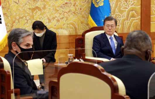 문 대통령은 “미국의 두 외교·안보 수장이 취임 후 우선적으로 한국을 방문한 것은 한미동맹을 중시하는 조 바이든 미국 대통령의 강력한 의지를 보여준 것”이라며 “바이든 행정부의 출범과 함께 시작된 미국의 귀환, 외교의 귀환, 동맹의 복원을 환영한다. 국제사회는 미국의 리더십에 크게 기대하고 있다”고 말했다.