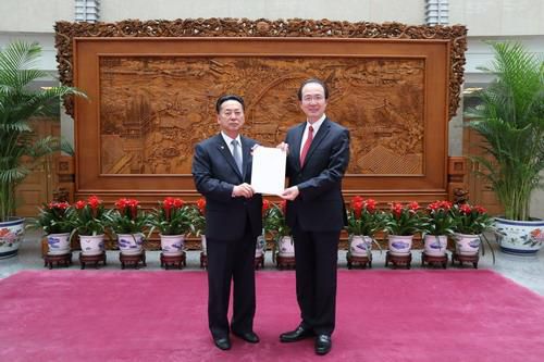 리룡남 신임 중국 대사(왼쪽)와 훙레이 중국 외교부 의전사 사장 [중국 외교부 웹사이트] |
