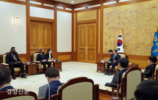 문재인 대통령이 18일 청와대에서 방한 중인 미국 토니 블링컨 국무장관과 로이드 오스틴 국방장관을 접견하고 있다. 청와대 제공 |