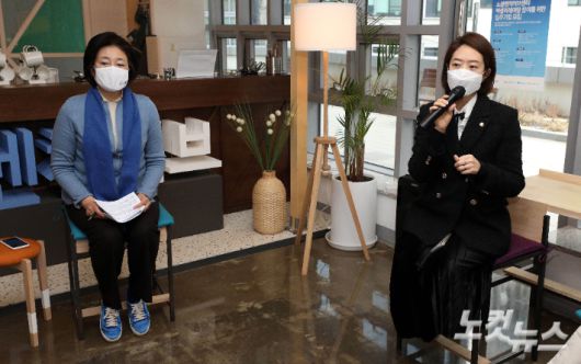 고민정 더불어민주당 의원(오른쪽)이 2월25일 박영선 서울시장 후보와 함께 서울 강남구 소셜벤처허브센터를 방문해 입주사 대표들과 간담회를 갖고 인사말을 하고 있다. 국회사진취재단 |