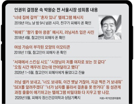 다만 인권위는 정신과 상담 기록에 대해선 “피해자가 고소를 결심한 이후 작성됐고, 박 전 시장의 진술을 청취할 수 없는 상황에서 사실 여부를 확인하기 어렵다”며 “성관계 방법을 설명하는 메시지 역시 이를 보거나 들은 참고인이 없고, 내용이 디지털 포렌식으로 복구되지 않아 확인하기 어렵다”고 했다.
