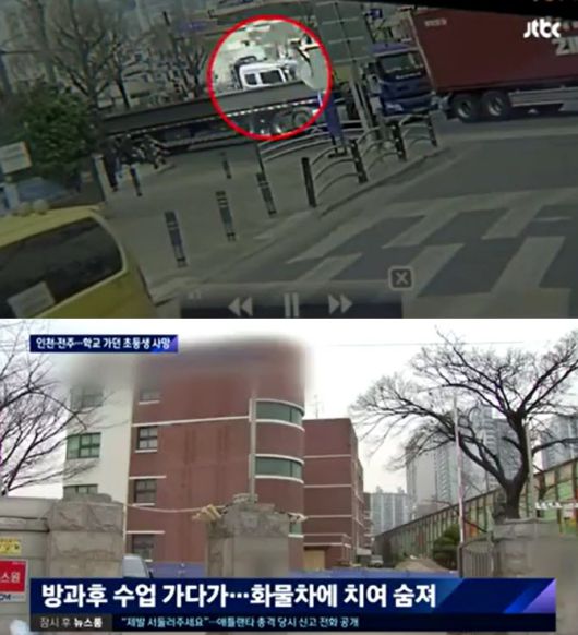 지난 18일 오후 1시50분께 인천시 중구 신흥동의 한 초등학교 앞 횡단보도를 건너던 초등학생이 화물차에 치여 사망했다. (사진=JTBC ‘뉴스룸’ 방송화면 캡처) |