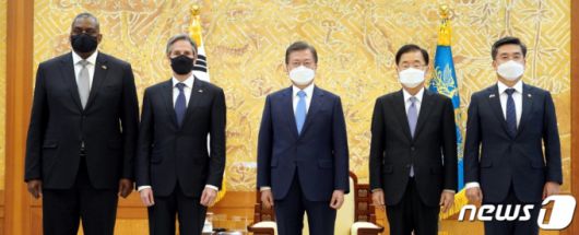 (서울=뉴스1) 이광호 기자 = 문재인 대통령이 18일 오후 청와대에서 미국의 토니 블링컨 국무장관과 로이드 오스틴 국방장관 접견에 앞서 기념촬영을 하고 있다. 왼쪽부터 오스틴, 블링컨 장관, 문 대통령, 정의용 외교부 장관, 서욱 국방부 장관. 2021.3.18/뉴스1 |