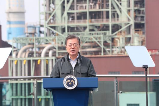 문재인 대통령이 19일 오후 충남 보령 화력발전소에서 열린 ‘충남 에너지전환과 그린뉴딜 전략 보고’에 참석, 발언하고 있다. (사진=연합뉴스) |