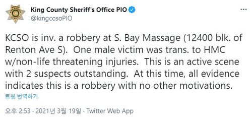 미국 워싱턴주(州) 시애틀의 한 스파에서 발생한 총격사건을 알리는 현지 보안관실 트위터. [트위터 갈무리=연합뉴스] |