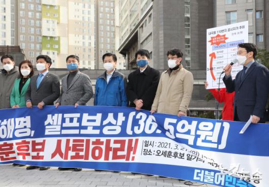 21일 오후 더불어민주당 야당후보검증 태스크포스(TF)팀이 오세훈 서울시장 재임 시절 당시 처가가 소유한 내곡동 땅 부지가 국민임대주택지구 부지로 지정돼 36억원의 보상을 받았다는 의혹이 제기된 내곡동 주택지구를 둘러 본 후, 천준호 의원이 발언을 하고 있다.