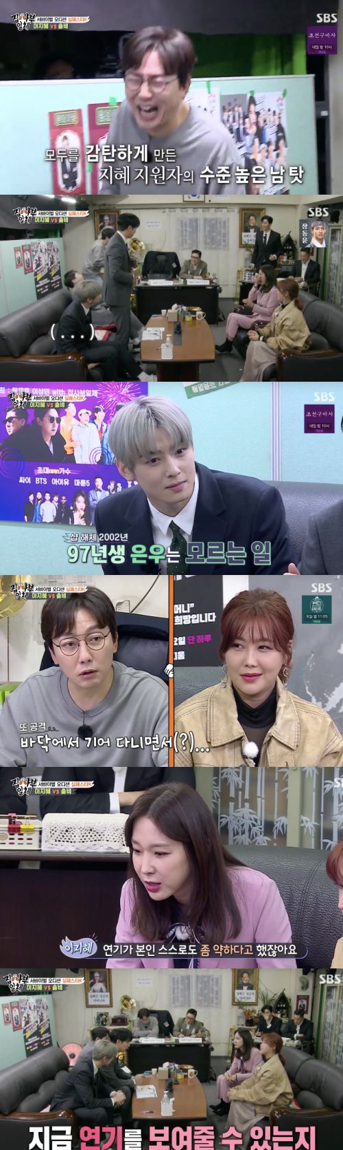 알고보니 이지혜와 솔비였다. 이지혜는 “내 실패로 모두 울릴 수 있다”고 했고 솔비도 만만치 않은 부정적인 기운을 뿜었다. 이때, 차은우가 들어오자 두 사람은 “만화 캐릭터가 들어온 줄 알았다”며 눈을 떼지 못 했다.