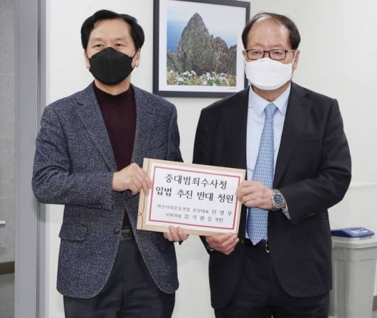 [서울=뉴시스]김진아 기자 = 김기현(왼쪽) 국민의힘 의원과 신영무 바른사회운동연합 대표가 4일 오후 서울 여의도 국회 의원회관 국회민원지원센터에 ‘중대범죄수사청 설치 및 검찰청 폐지 입법 추진 반대’ 국회 청원서를 제출하고 있다. 2021.03.04. bluesoda@newsis.com |