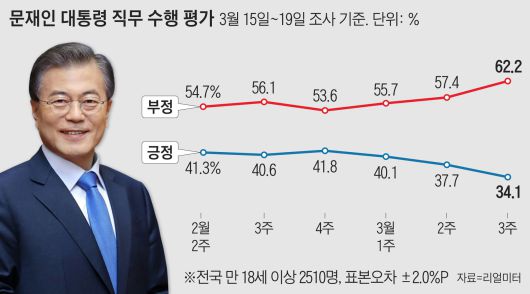 리얼미터가 YTN 의뢰로 지난 15∼19일 전국 18세 이상 2510명을 대상으로 조사한 결과 문 대통령의 국정수행 지지율(긍정 평가)은 전 주 대비 3.6%포인트 하락한 34.1%로 나타났다.