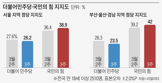 부산시장 보궐선거를 앞둔 부산·울산·경남에서는 민주당은 2.8%포인트 하락한 23.5%, 국민의힘은 2.8%포인트 오른 42.0%로, 격차가 18.5%포인트까지 벌어졌다.
