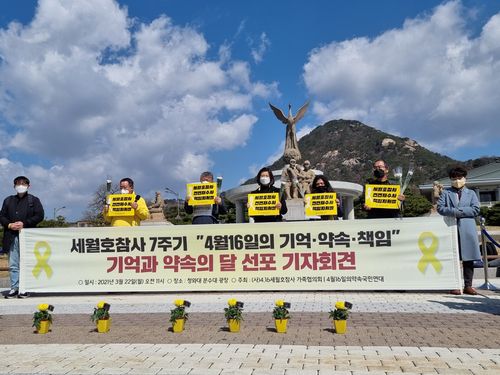 4·16세월호참사가족협의회와 4월16일의 약속 국민연대(4·16연대)는 22일 청와대 분수대 앞에서 연 '세월호 참사 7주기 기억과 약속의 달' 선포 기자회견에서 "문재인 정부가 책임을 다하기 위한 시간이 얼마 남지 않았다"며 이같이 밝혔다.
