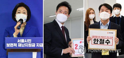(서울=연합뉴스) 고동욱 기자 = 국민의힘 오세훈·국민의당 안철수 서울시장 후보 가운데 누가 단일후보로 나서더라도 더불어민주당 박영선 후보에 크게 앞선다는 여론조사 결과가 22일 나왔다.