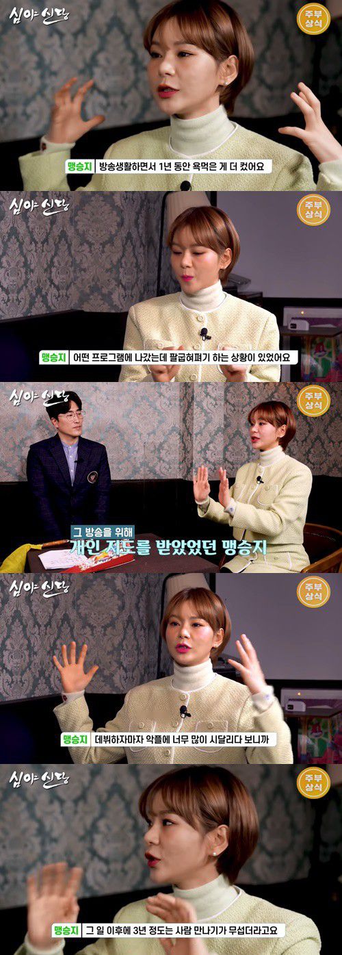 개그우먼 맹승지가 극심한 악플에 힘든 시간을 보냈다고 밝혔다.