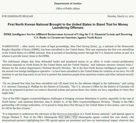미 법무부는 이날 발표한 보도자료에서 약 2년의 법적 절차 끝에 문씨의 신병을 인도받았다면서 문씨가 이날 워싱턴 법정에 처음 출석했다고 밝혔다. 미 법무부는 “이번 사건은 북한 국적자가 미국에 인도된 첫번째 사례”라고 설명했다.