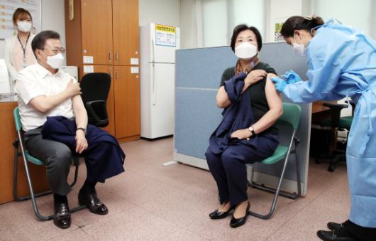 [파이낸셜뉴스] 문재인 대통령 내외는 23일 오전 9시 서울시 종로구 보건소를 방문해 아스트라제네카 백신으로 코로나19 예방접종을 받았다.