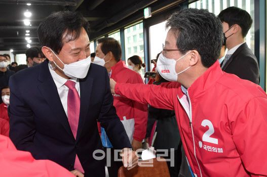 국민의힘 오세훈 서울시장 후보가 지난 11일 서울 여의도 중앙당사에서 열린 4.7 보궐선거 서울선거대책위원회 발대식에서 유승민 공동선대위원장과 인사하고 있다.(사진=노진환 기자) |