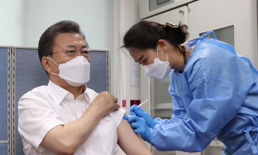 문재인 대통령과 김정숙 여사가 23일 오전 아스트라제네카(AZ) 백신으로 코로나19 예방접종을 받았다.