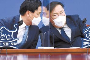 김태년 더불어민주당 대표 직무대행은 23일 오전 국회에서 열린 원내대책회의에서 모두 발언 후 김영진 원내수석부대표로부터 서울시장 야권 단일화 소식을 전해 듣고 있다. 이상섭 기자 |