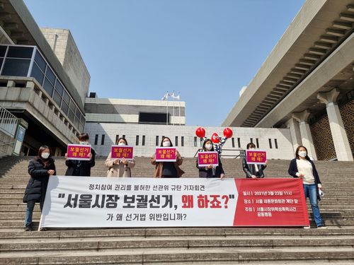 (서울=연합뉴스) 정성조 기자 = 서울시장위력성폭력사건공동행동(공동행동)은 23일 서울 종로구 세종문화회관 앞에서 기자회견을 열고 '보궐선거 왜 하죠?' 등 공동행동의 캠페인 문구를 서울시 선거관리위원회가 별다른 근거 없이 공직선거법 위반으로 해석했다고 규탄했다.