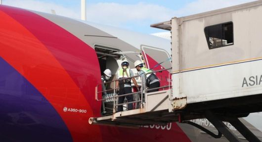 아시아나항공 관계자들이 A350 여객기에 화물을 싣고 있다. /연합뉴스 |