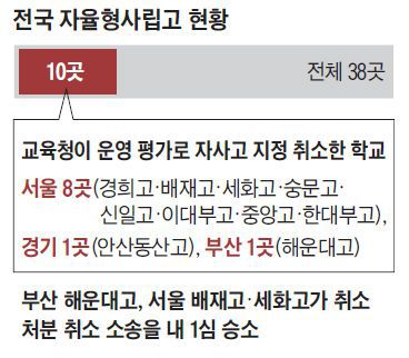 이들 학교는 이후 법원에 효력정지 가처분 신청과 행정소송을 제기했다. 현재는 가처분 신청이 모두 인용돼 자사고 지위를 유지하면서 ‘지정취소’ 본안(本案)을 다투고 있다.