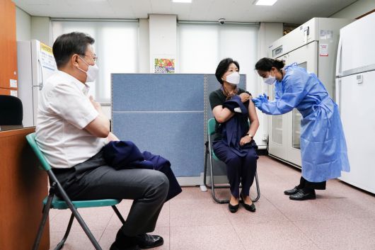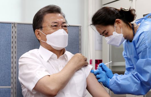 문재인 대통령 부부가 오는 6월 G7(주요 7개국) 정상회의 참석 차원에서 23일 아스트라제네카(AZ) 사의 신종 코로나바이러스 감염증(코로나19) 백신을 접종했다. 질병관리청이 마련한 '필수목적 출국을 위한 예방접종 절차'에 따라 만 65세 이상 요양병원 종사자 등에 대한 AZ 백신 접종 첫날 문 대통령 부부가 맞은 것이다.