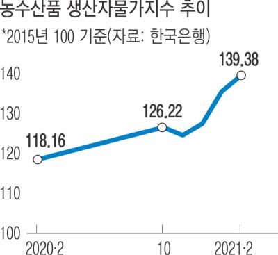 주요 품목을 보면 풋고추가 한 달 사이 127.3% 올랐고, 파(42.4%), 배추(52.6%), 달걀(22.5%), 게(15.6%), 우럭(19.5%) 등도 같은 기간 큰 폭 올랐다. 파는 1년 전과 비교하면 341.8%나 올랐다. 김영환 한은 경제통계국 물가통계팀장은 “한파, AI 확산에 따른 출하량 감소 등으로 농산물과 축산물이 오르면서 농림수산품 물가 상승을 이끌었다”고 설명했다.