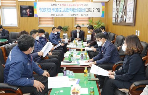 (울산=연합뉴스) 김근주 기자 = 울산시 동구의회는 24일 의장실에서 현대중공업·현대미포조선 사내 협력사 협의회와 간담회를 열었다.