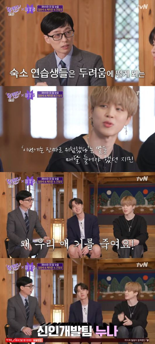 이날 방송에서 유재석은 "방탄소년단이 연습생 때 회사 쪽에서 연락이 오면 다들 두려워했다고 하더라"고 말했다.