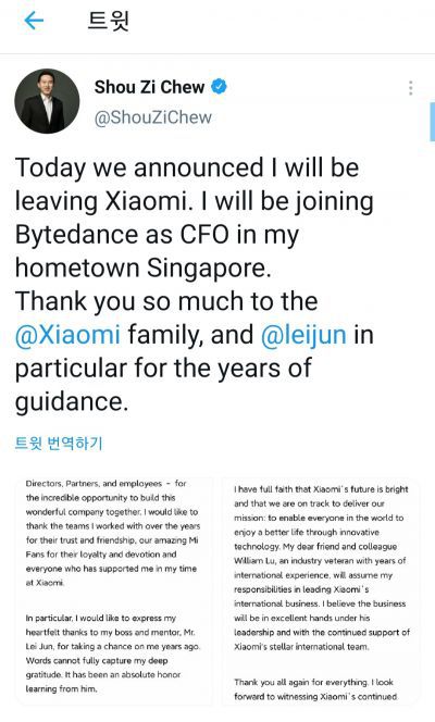 쇼우 지 츄 국제회장은 지난 24일(한국시간) 오후 7시경 개인 트위터를 통해 "오늘 샤오미는 제가 회사를 떠난다고 발표했다"며 이 같은 소식을 직접 알렸다. 샤오미는 전날 오전 그의 사임안을 제출했다.