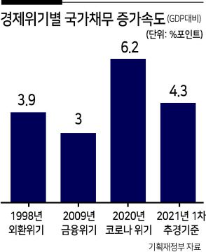 나랏빚 증가속도는 역대 최고로 빠르다. 지난해 국가채무 GDP 대비 비율은 43.9%로 2019년말 대비 6.2%포인트 늘어났다. 상승폭이 외환위기를 맞은 1998년(3.9%포인트)이나 글로벌 금융위기가 당시인 2009년(3.0%포인트)보다 1.5배에서 2배가량 크다. 코로나19로 인한 경제위기 극복 등을 이유로 늘린 나랏빚이 IMF시절보다 큰 것이다.