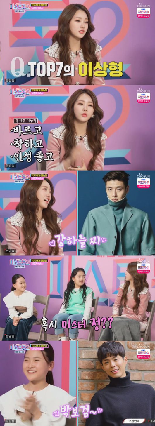양지은의 이상형은 키가 크고 속쌍커풀이고 흑발이 잘 어울리는 남자였다. 이정재 배우를 언급하기도. 김다현은 이상형으로 정동원이 아닌 박보검을 언급했다. 김태연은 "눈은 크고 찢어지고 코는 반듯했으면 좋겠다"며 박서준이 이상형이라고 덧붙였다.