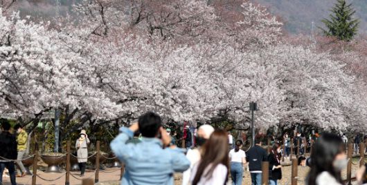 25일 오후 경남 창원시 진해구 경화역공원을 찾은 시민이 벚꽃 구경을 하고 있다. 창원시는 지난해에 이어 올해도 전국 최대규모 벚꽃 축제인 진해 군항제를 취소했다. 연합뉴스 |