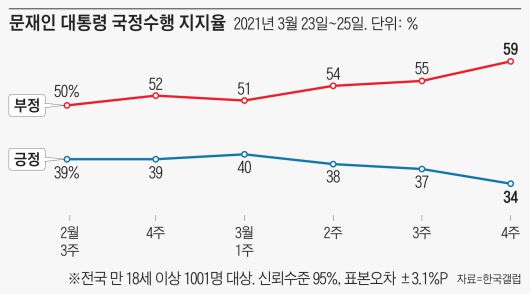 지난주 조사보다 직무 긍정률이 3%포인트 하락했고, 부정률은 4%포인트 올라 지난해 12월부터 4개월 가까이 머물던 범위(긍정률 37~40%, 부정률 50~55%)를 벗어났다.