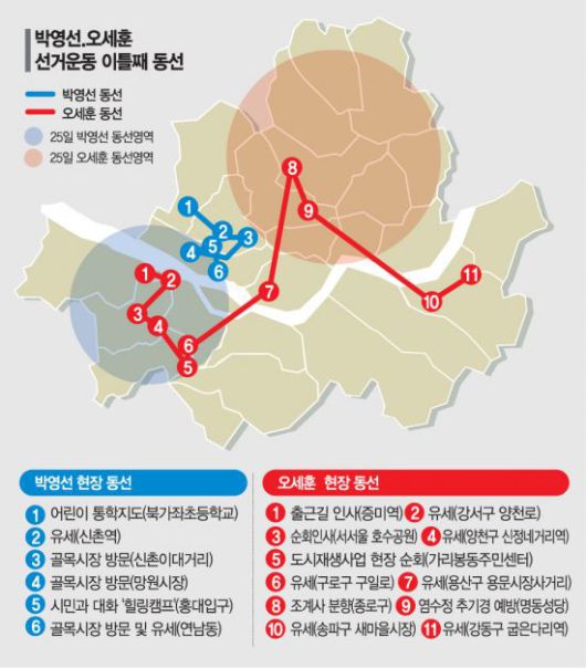 ◆‘대학가’ 도는 박영선 vs 보수층 낮은 곳 찾는 오세훈= 박 후보의 25~26일 동선을 보면 일자리·복지·부동산 등에 힘을 주며 대학가를 주로 찾고 있다. 오 후보는 상대적으로 보수 지지가 약한 강북지역을 찾은 후(25일), 26일에는 서울을 서(西)에서 동(東)으로 횡단했다. 해당 지역들도 국민의힘 열세 지역이다.