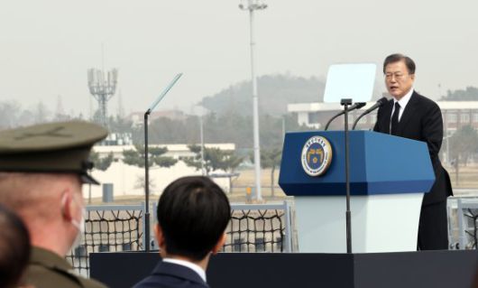 문 대통령은 이날 경기도 평택시 해군 2함대사령부에서 열린 '제6회 서해수호의 날'에 참석, 기념사를 통해 "지금은 남북미 모두가 대화를 이어 나가기 위해 노력해야 할 때"라며 "대화의 분위기에 어려움을 주는 일은 결코 바람직하지 않다"고 지적했다.