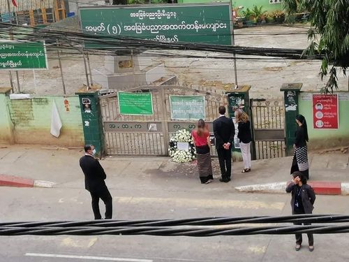 외국인과 현지인들로 보이는 5~6명이 양곤의 한 고등학교 교문 앞에 조화를 놓고 있는 듯한 모습이었다.