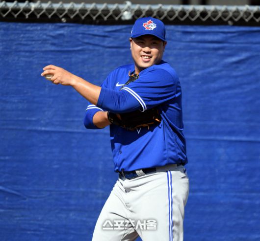 토론토 류현진이 지난해 2월 17일(한국시간) 플로리다 더니든 바비 매틱 트레이닝 센터에서 열린 스프링캠프에 참가해 불펜 피칭 전 웃고 있다. 최승섭기자 thunder@sportsseoul.com |