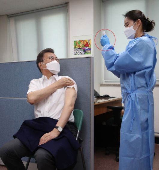 문 대통령의 백신 접종 영상을 두고 바꿔치기 의혹이 떠돌았다. 접종 직전 다시 끼워져 있던 주사기 ‘뚜껑’이 논란의 원인이 됐다.