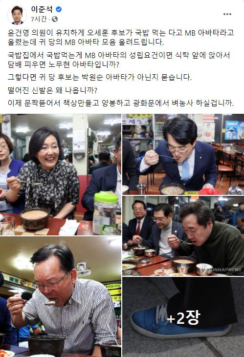 오세훈 국민의힘 서울시장 후보 캠프의 뉴미디어본부장을 맡고 있는 이 전 최고 위원은 지난 27일 자신의 페이스북에 “윤건영 의원이 유치하게 오세훈 후보가 국밥 먹는다고 MB 아바타라고 올렸는데 귀 당의 MB 아바타 모음 올려드린다”며 박 후보와 이 위원장, 박용진 민주당 의원, 김부겸 전 의원 등이 국밥을 먹는 사진을 올렸다.