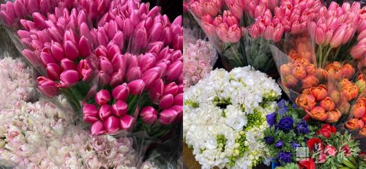 분홍 튤립의 꽃말은 사랑의 시작 그리고 배려. 보라 튤립은 영원한 애정. 망고 튤립 (꽃잎이 분홍, 주황, 노랑 등 다양한 색상의 조합이라 이름 붙임)은 수줍음 또는 매혹적 사랑. 주황 튤립은 수줍음, 부끄러움, 온정으로 색상 별로 꽃말의 뜻이 다르다.