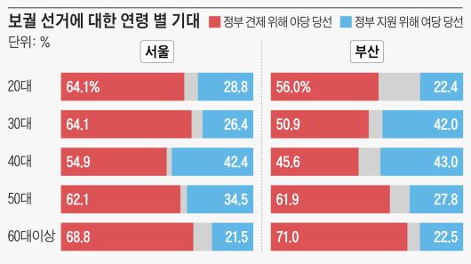 부산시장 선거에 대해서도 정부 견제론 59.5%, 정부 지원론 29.8%였고 연령별로 정부 견제론은 20대 56.0%, 30대 50.9%, 50대 61.9% 60대 이상 71.0% 등으로 다수였다. 부산 40대는 정부 견제론(45.6%)과 정부 지원론(43.0%)이 오차 범위 안에 있었다.