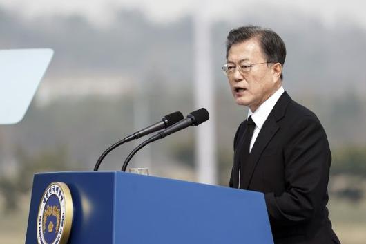 문재인 대통령이 지난 26일 오후 경기도 평택시 해군 2함대사령부 천자봉함·노적봉함에서 열린 제6회 서해수호의 날 기념식에 참석해 기념사를 하고 있다. 뉴시스 제공 |